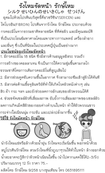 รังไหม ของ รักษ์ไหม (Silk Cocoon Facial Scrub) สรรพคุณ _ รังไหมของรักษ์ไหมสีเหลืองทองธรรมชาติ และ สีขาว ไม่ผ่านกระบวนการ ทางเคมี ด้วยขบวนการคัดสรรรังไหมให้ได้คุณภาพดีเยี่ยม ในรังไหมแต่ละชิ้นของรักษ์ไหม อุดมไปด้วยโปรตีนธรรมชาติ หรือ เซริซิน(Sericin) ซึ่งมีสารอนุมูลอิสระ ซ่อมแซมและฟื้นฟูผิวหน้า เป็นการสครับผิวหน้าอย่างอ่อนโยนและธรรมชาติ ช่วยลดปัญหาสิวเสี้ยนและสิวอุดตัน ทำให้ผิวเนียน นุ่ม สะอาดล้ำลึก เผยผิวกระจ่างใส วิธีการใช้ ฟอกหน้าด้วยสบู่รักษ์ไหม ล้าง หรือ แช่ น้ำอุ่น ใช้รังไหมสวมที่ปลายนิ้ว หรือจับรังไหม ถูวนเป็นวงกลมประมาณ 1-2 นาที เพื่อให้ โปรตีนไหม และ วิตามินต่างๆ ในสบู่รักษ์ไหม ได้ซึมลงผิวหน้า หลังจากนั้นล้างหน้าให้สะอาดด้วยน้ำเปล่า (ไม่ต้องนำไปตากแดด) โดยรังไหม 1 ชิ้น สำหรับ 1 วัน ใช้ได้ประมาณ 3-4 ครั้ง แล้วเปลี่ยนใช้รังไหมชิ้นใหม่ ทั้งนี้เพื่อให้เกิดประสิทธิภาพสูงสุด ควรใช้รังไหมควบคู่ไปกับสบู่หน้าของรักษ์ไหมเป็นประจำทุกวัน เพื่อผลลัพธ์ของผิวหน้าที่เนียน นุ่ม มหัศจรรย์แห่งผลลัพธ์หลังการใช้